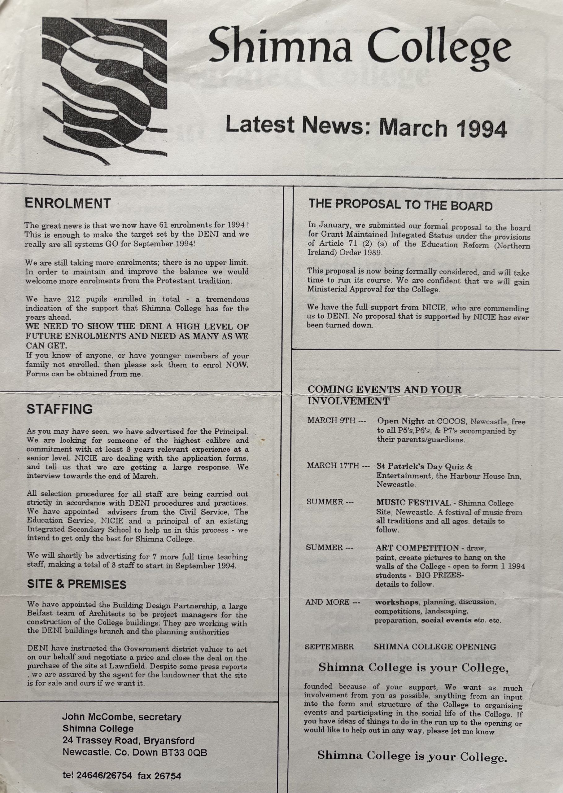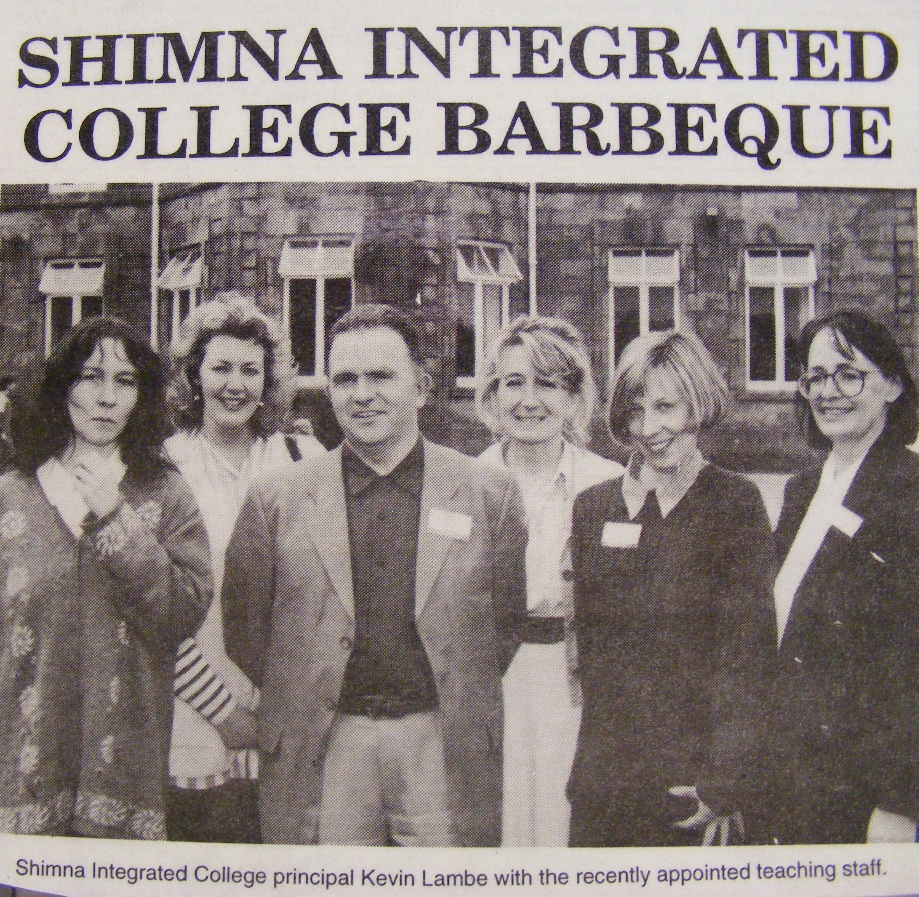 The next significant day was when they met NICIE Development Officer Kevin Lambe, who in two short years as Development Officer at the newly constituted NICIE, had supported groups of parents across Northern Ireland in setting up thirteen Integrated schools. The meeting on 2nd October 1993 in the Burrendale Hotel was hugely significant in that the meeting brought together other parents from across South Down who were also seeking to break through divisions and educate their children together. That was the meeting where the Agreed Statements were developed on which Shimna Integrated College would be founded. There were the days when Kevin Lambe was appointed principal in competitive interviews, also in the Burrendale Hotel, and when the team of seven teachers was appointed.