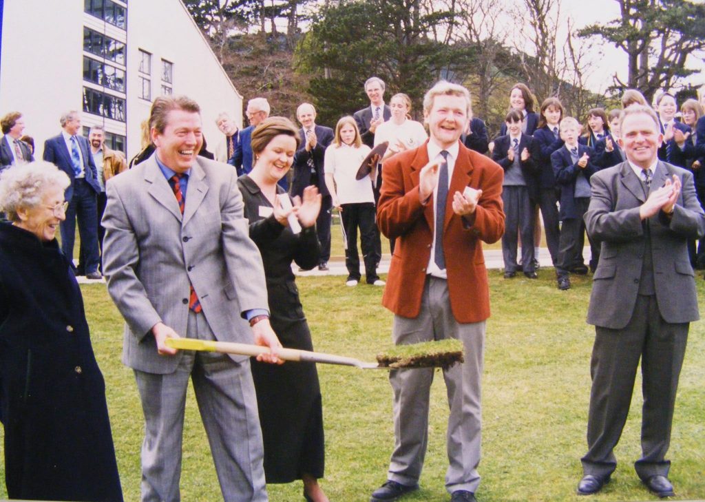 There was the day that Kevin and founder parent David McGinn discovered Murlough House, not only spacious enough to house the school for the first year, but also, thanks to previous owner Queen’s University, with a modern laboratory building! The first meeting of staff took place in June 1994 in Murlough, followed by trips with the architect Arthur Acheson to visit other quick build sites with the promise that we really could build a school in a year. There was the day when Gordon Wilson travelled from Enniskillen to cut the first sod on the Lawnfield site, which we didn’t yet own! There were the meetings with Philip Woods and Sean Killough of the Allied Irish Bank, when Kevin persuaded them somehow that lending us a million and a half was a good investment. This time in the meetings were in the magnificent setting of the Enniskeen gazing out over the mountains.