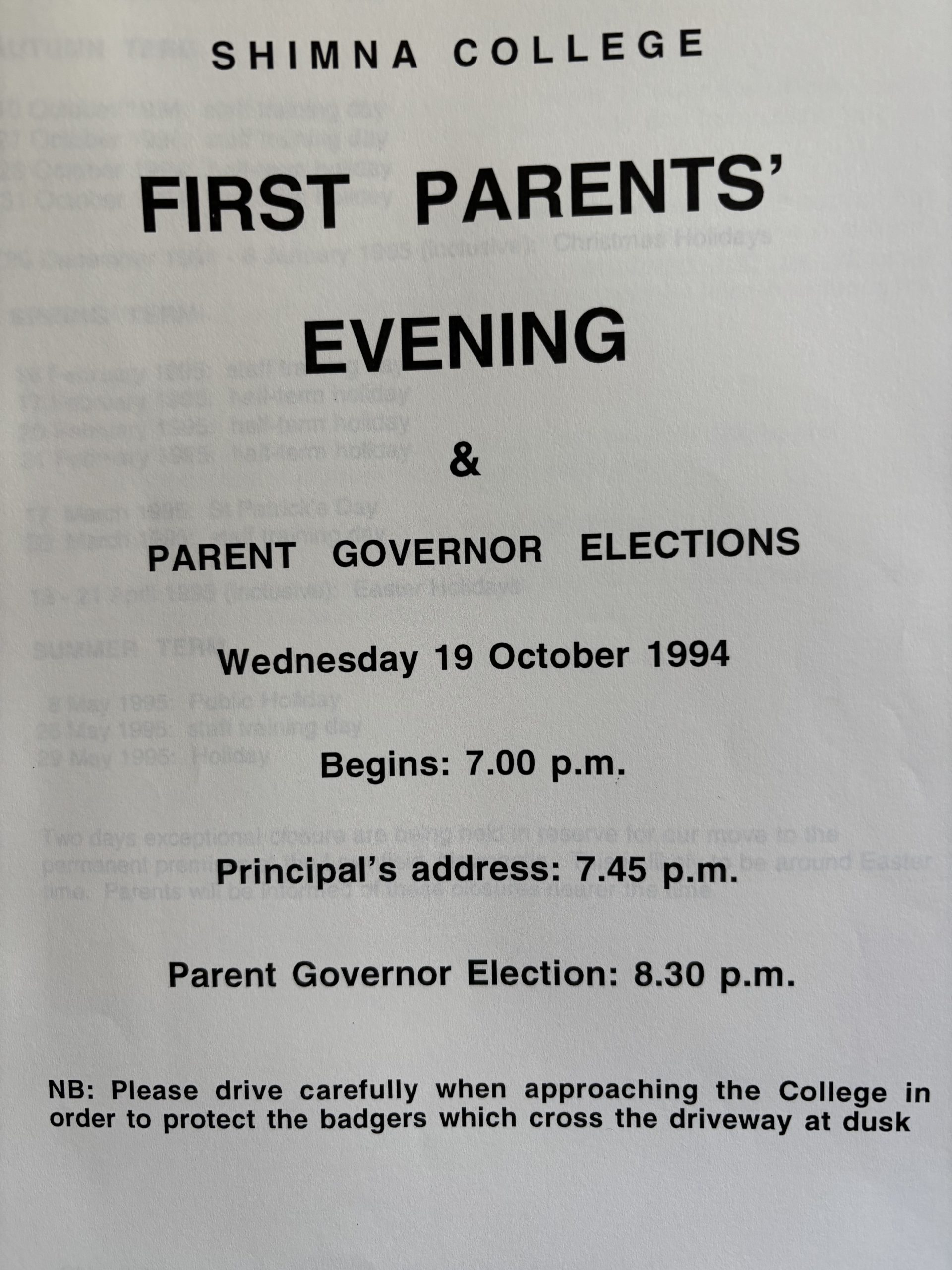 There was our first ever Parents Consultation evening on 19th October 1994, when we had to warn of badgers crossing! There was the first meeting of the Parent Council, a central pillar of Integration. A unique feature of Integrated schools is that they are founded by parents, and the status of the Parent Council is enshrined in the Articles of Association of Shimna Integrated College.