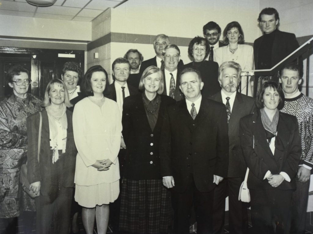 There was a wonderful day in June, when the first cohort of Shimna students moved to the new building on the Lawnfield site. There was the official opening on 13th December 1995, with a power cut, poetry, music, a Lambeg and a bodhran sounding out together. As happened on a number of occasions, our guest for the official opening, in this case Secretary of State Sir Patrick Mayhew, had to cancel at the last minute as work towards a lasting peace continued, but we were delighted that his wife Lady Mayhew came to do the honours and perform the official opening. Every year after that brought a special day as we continued to move into newly opened sections of our building, following Arthur’s ingenious plan to open up attics and basements, always providing the facilities in time for our students studying for GCSE and A level.
