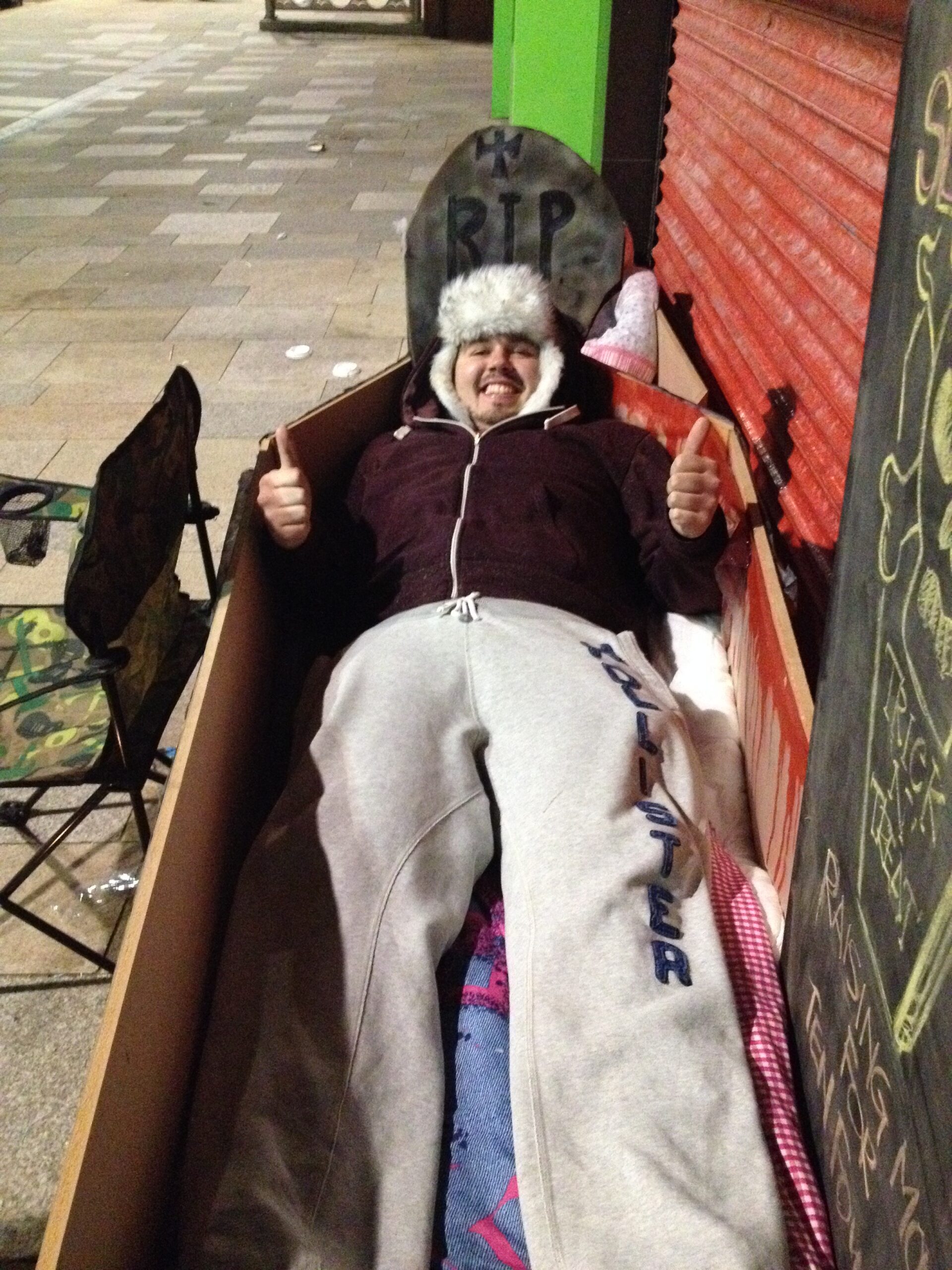 Another local charity, the TENS Foundation had a pop-up charity shop in Newcastle, and OldScholar and former staff member John, and his dad, staged a sleep out in a coffin to raise funds for the charities work in the Philippines.