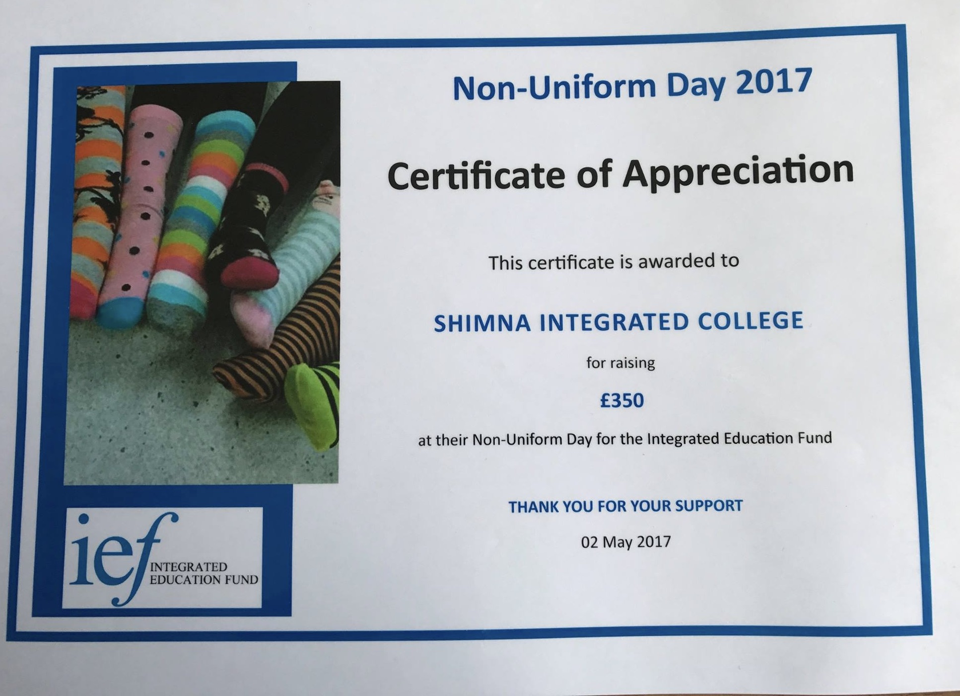 Closer to home, at Shimna everyone is very aware that without the support of the Integrated Education Fund in offering to guarantee the bank loan with which we built our school, Shimna simply wouldn’t have existed. The IEF also helped us find funding for the classrooms on the maths/history/politics corridor, and directly funded the lovely room downstairs in the Forbes building. That’s as well as constant support through Carson bursaries and support for our primary languages outreach. Every year, during Integrated Education Week, the IEF asks all integrated schools to hold an Odd Socks fundraiser, and Shimna never failed.